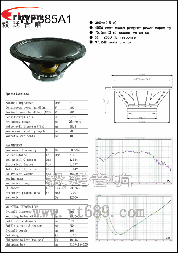 390mm圓形鋁盆架外磁重低音喇叭,采用的是以精鋼沖壓成型鋁鑄結(jié)構(gòu),表面涂覆雅典黑,穩(wěn)固牢靠,聲音更具穩(wěn)定性,精美的鍍銅接線端子,接線方便。