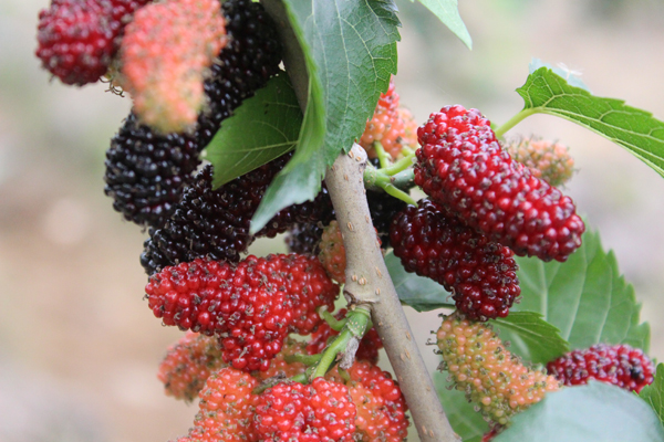 桑椹既可入食,又可入藥,中醫認為桑椹味甘酸,性微寒,入心、肝、腎經,為滋補強壯、養心益智佳果。具有補血滋陰,生津止渴,潤腸燥等功效,主治陰血不足而致的頭暈目眩,耳鳴心悸,煩躁失眠,腰膝酸軟,須發早白,消渴口干,大便干結等癥。桑子綠色變紅色再黑色,是一個漫長的過程↓