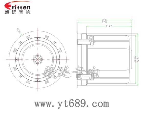 描述:圓形鐵盆架橡膠邊PP盆25芯外磁帶鐵筒高音可旋轉8寸25芯60瓦天花全頻喇叭;