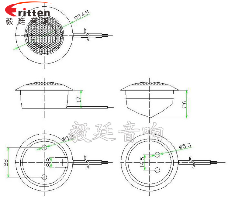 2寸鐵盆架內磁高音喇叭,采用的是高性能稀土高強磁,強勁有力,帶黑色孔外殼25mm長紅黑線,便于安裝;