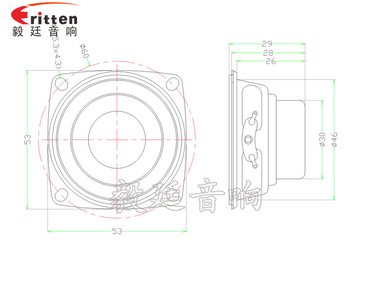 描述:方型鐵盆架橡膠邊紙盆紙帽20芯內(nèi)磁53mm8w故事機(jī)喇叭;